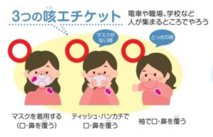 ちなみに、せき・くしゃみを手で押さえるのはマナー違反となります。